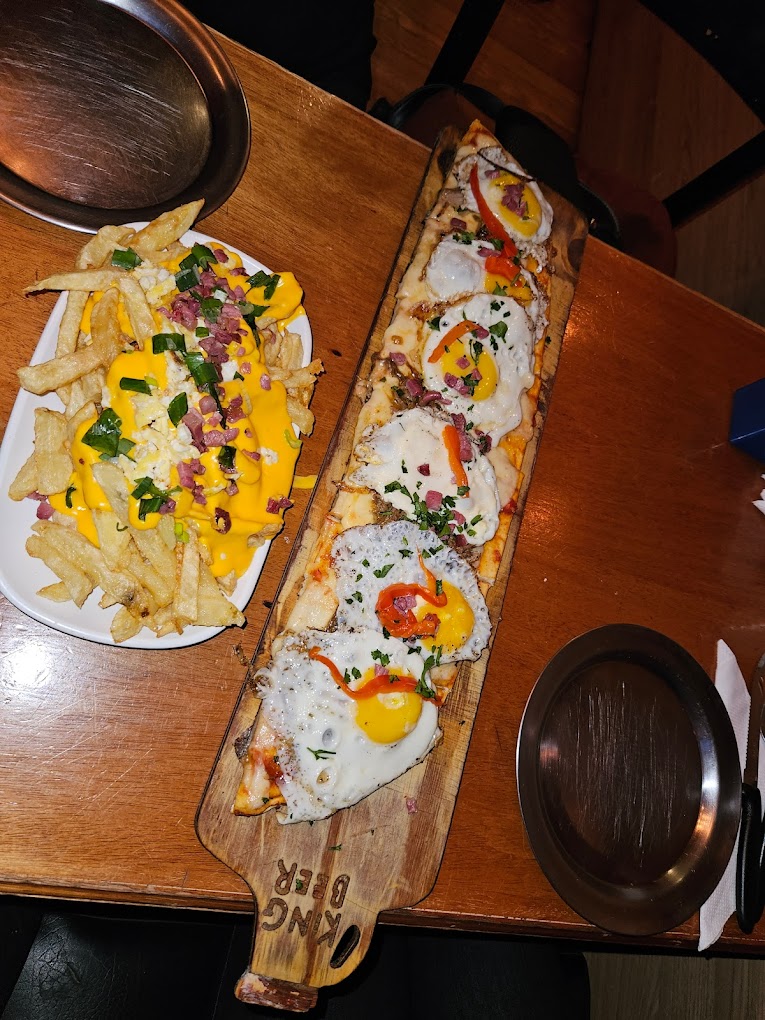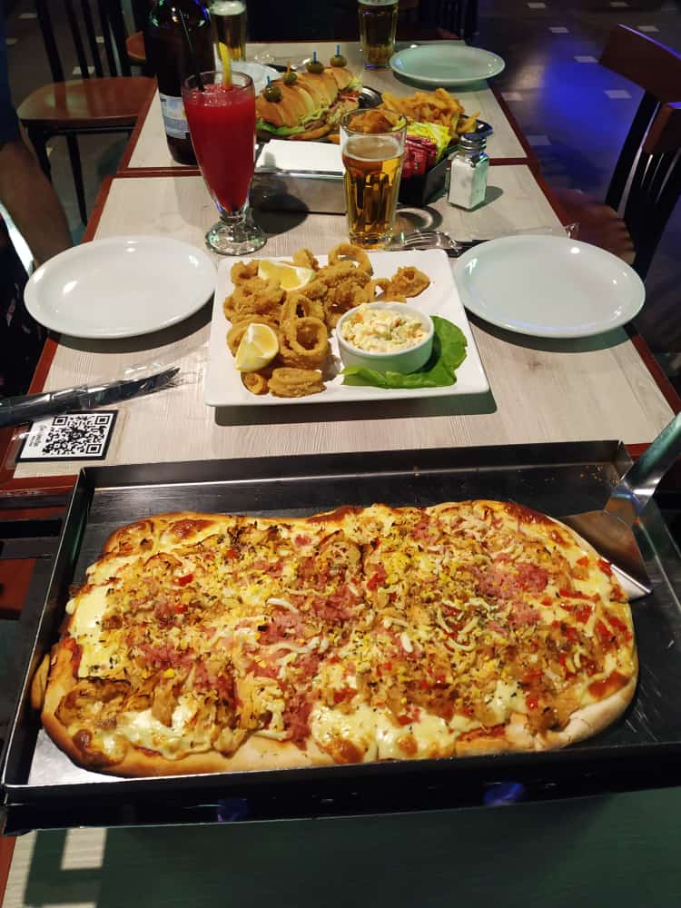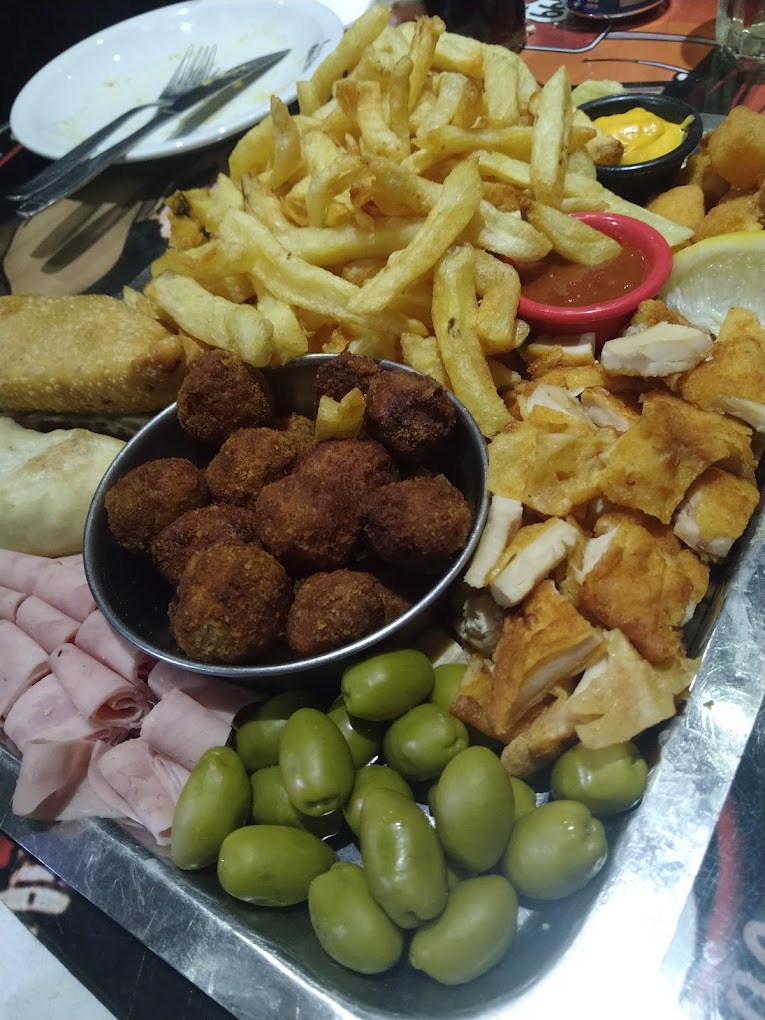 Hamburguesas y pizzas. Tienen la cocina abierta hasta las 6/7 los fines de semana para el after bajón de los boliches de la zona.