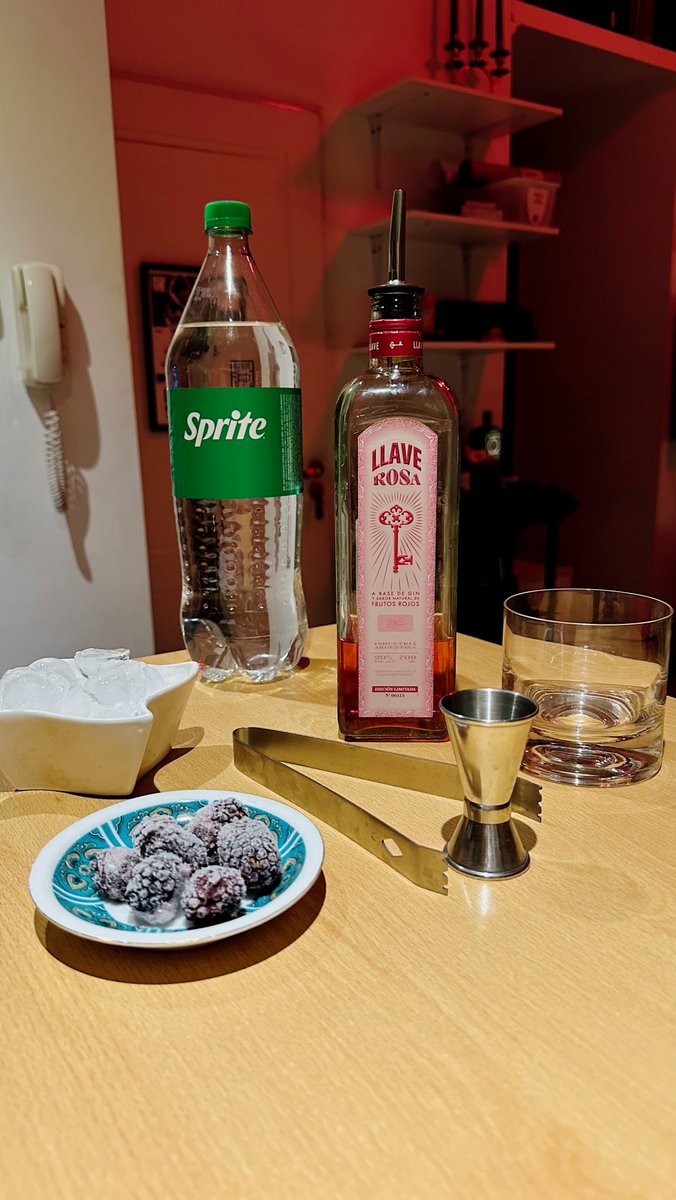 El cóctel fácil es recontra fresco, para el verano y se hace con cosas que comprás en el super: vaso corto, Llave Rosa Frutos Rojos y Sprite o cualquier gaseosa de lima limón. A eso lo podés decorar con algo que le dé color, puede ser frutilla o más lindo arándanos y frambuesas.