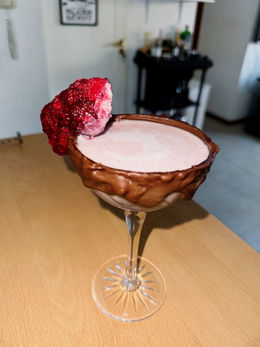 Instrucciones: mezclar el gin, triple sec, la crema y el almíbar en el vaso mezclador con hielo. Agitar con fuerza. Colar y servir en un vaso de martini y decorar con las frambuesas y el chocolate derretido.