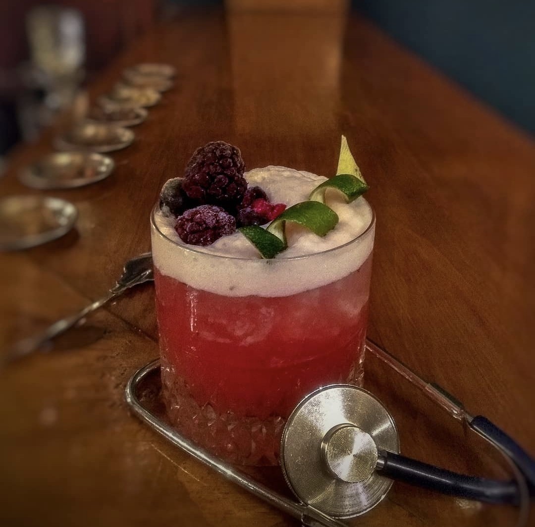 «Tragos de autor, con nombres de medicinas como Jarabe para la tos o Clonazepam. Cervezas, tapas, platos varios, veggies, pizzas. Interior y patio. Mozos con delantales de médicos, paredes con fórmulas magistrales» @nataliamarun