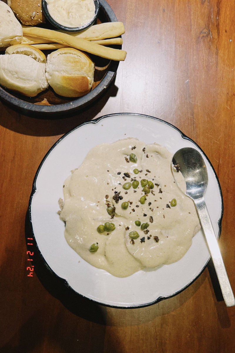 De entrada pedí el Vitel toné. De peceto, bien hecho con una cosita extra en la mezcla de crema y mayo: alcaparras, buena presencia de anchoas y polvo de aceitunas negras. Me parece un golazo que esto esté en la carta de un restaurante. Ojalá la tengan todo el año.