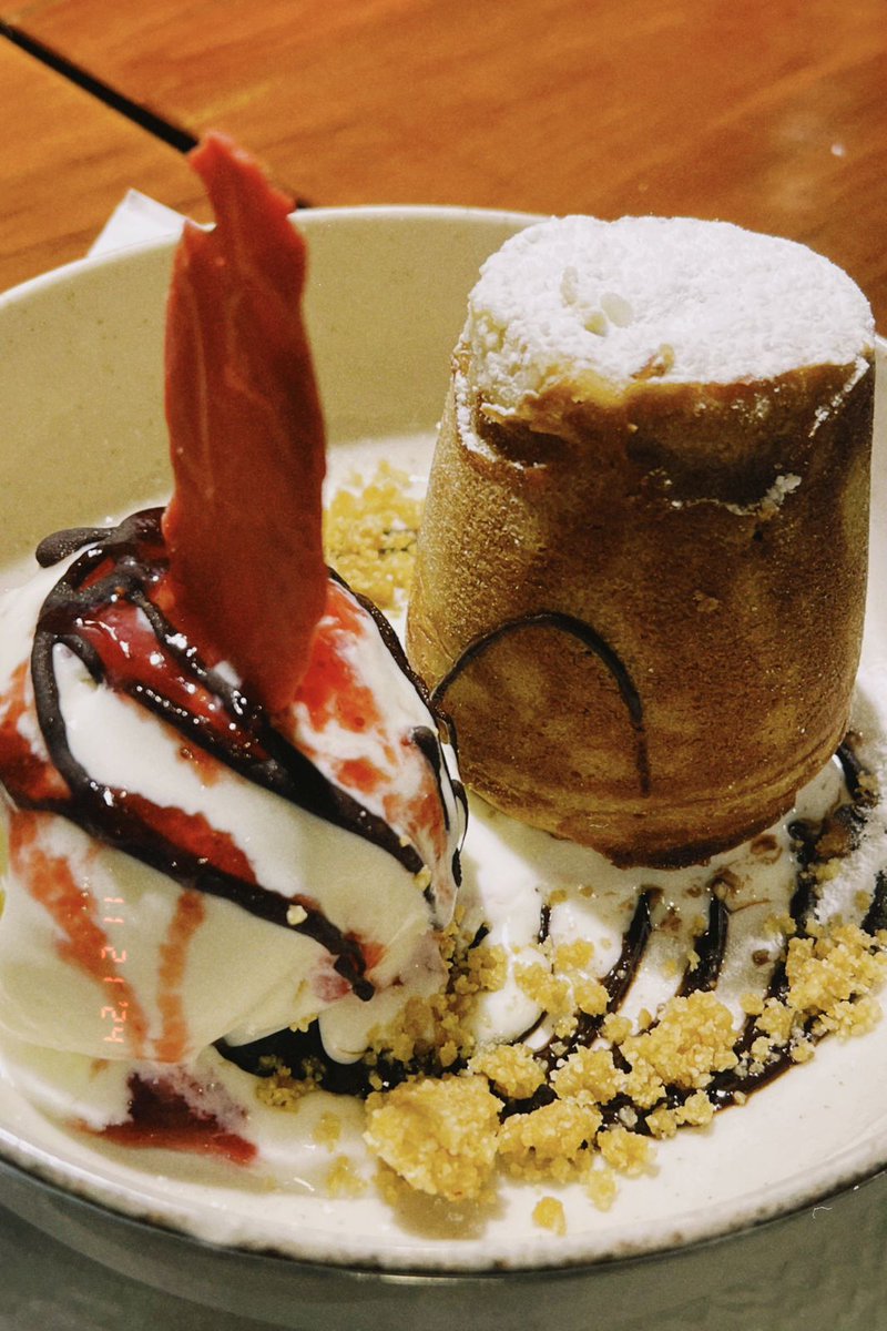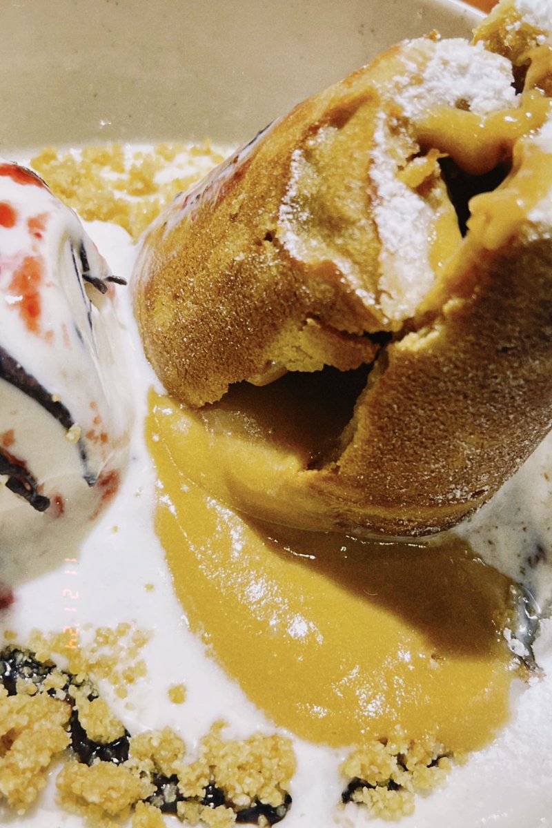 De postre, pedí un volcán de dulce de leche (me interesó porque es más común que haya de chocolate) y helado de americana. Correctamente ejecutado. Con algún detalle lindo como el crocante o un ganache de chocolate riquísimo debajo pegando las piezas al plato. $9500