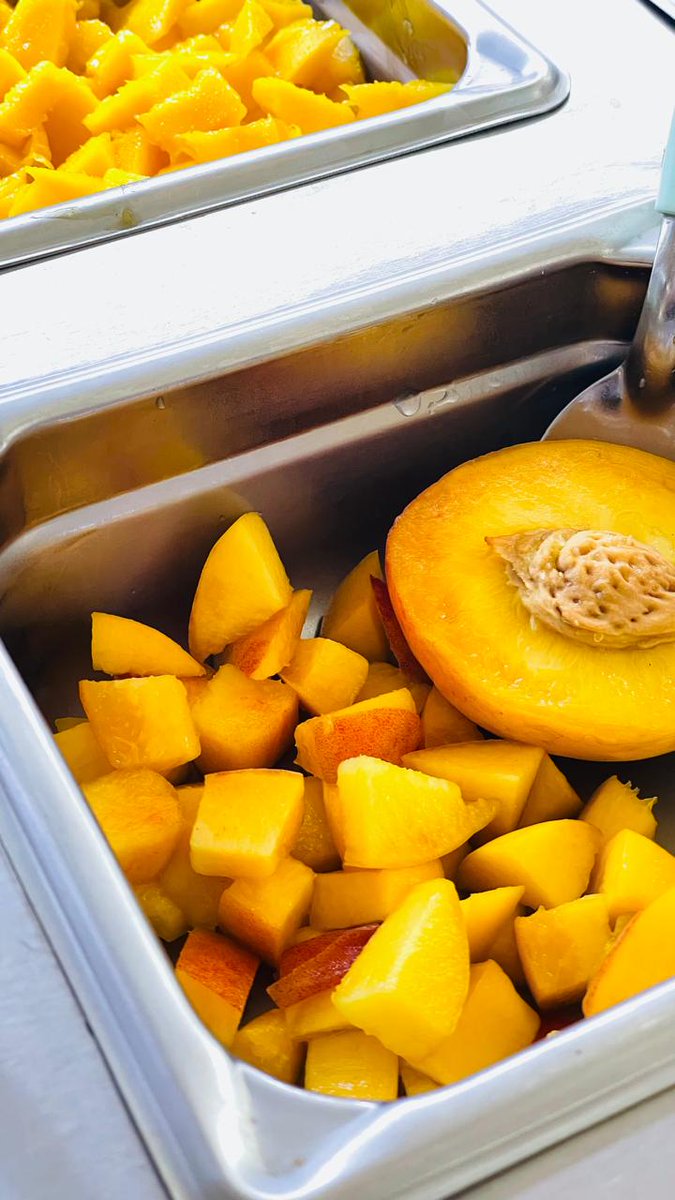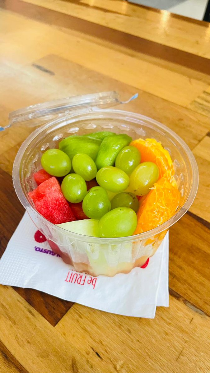 Tienen para elegir 18 toppings: 9 frutas y 9 golosinas. Las frutas son frescas, cortadas en el día. Nada de enlatados ni frutas congeladas. Van rotando por frutas de estación. Había mandarina, naranja, uva, mango, kiwi, cerezas, pomelo, ananá, banana, melón y durazno.
