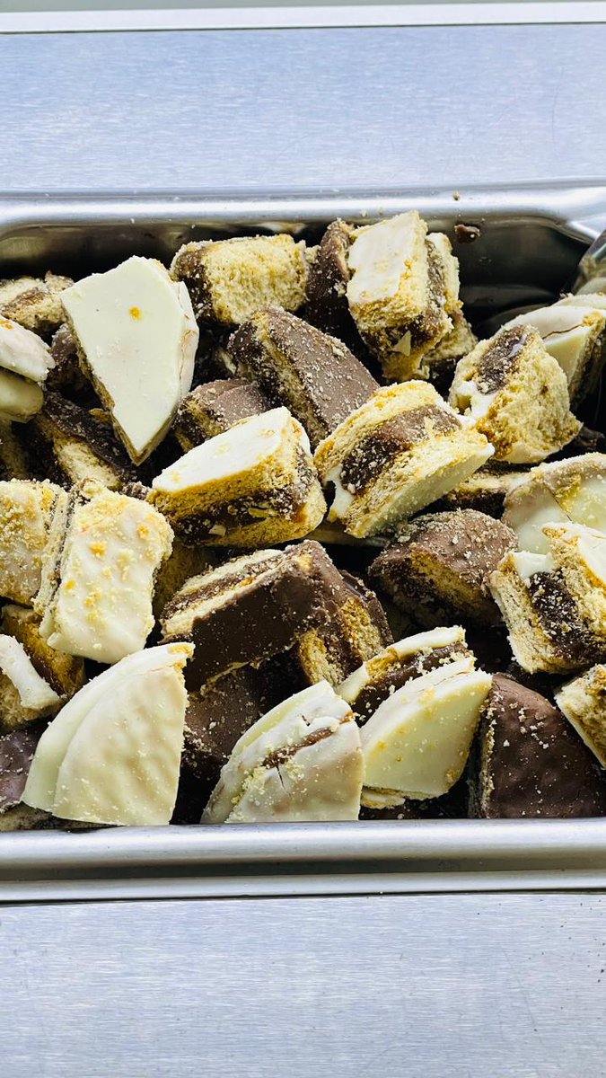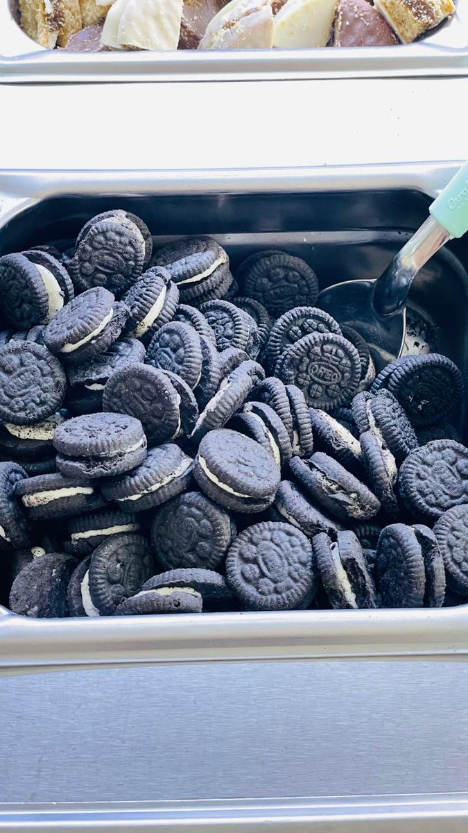 Los toppings secos son de buenas marcas: Mini Oreo, gomitas tipo Mogul, cookies Coffler, cubanitos de chocolate, alfajores Nevares blanco y negro, malvaviscos, cereales de chocolate, cereales azucarados y granola Felfort.