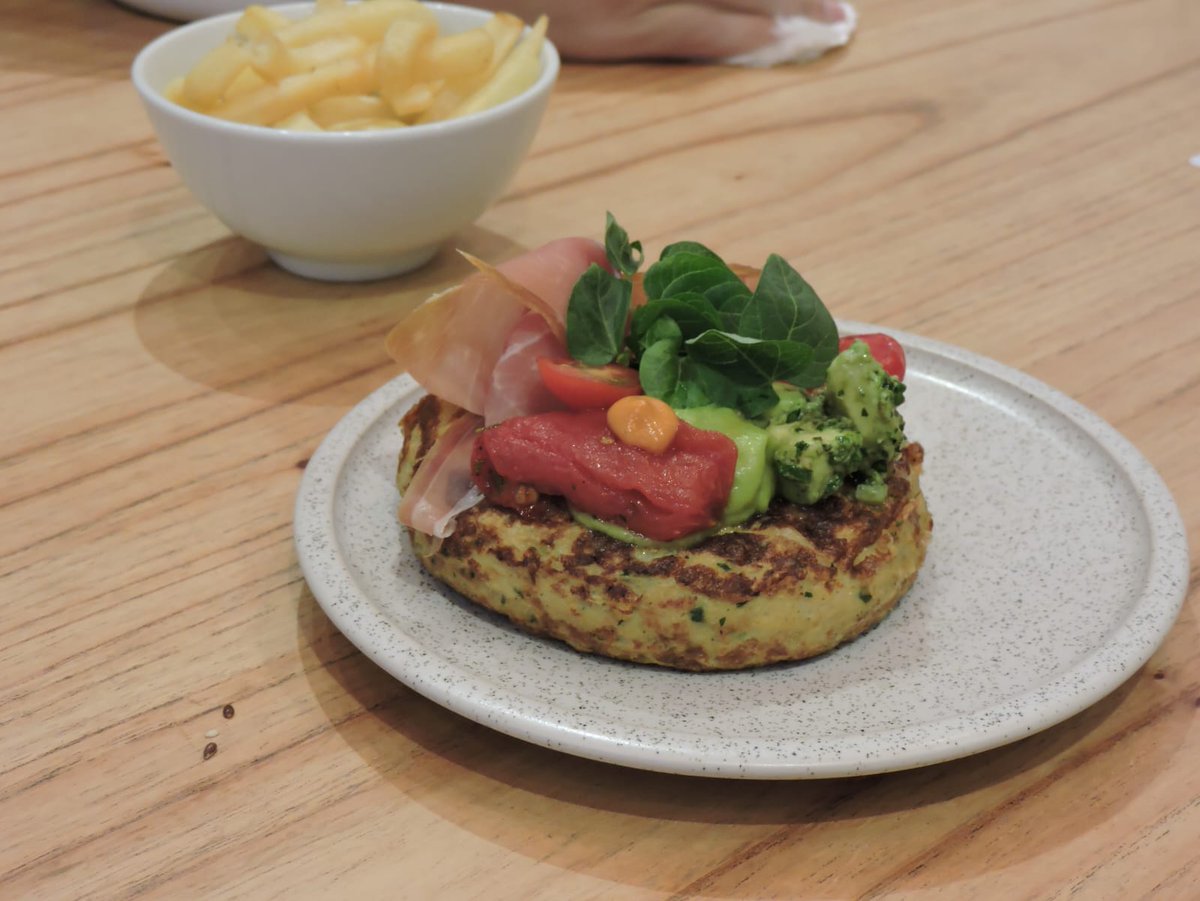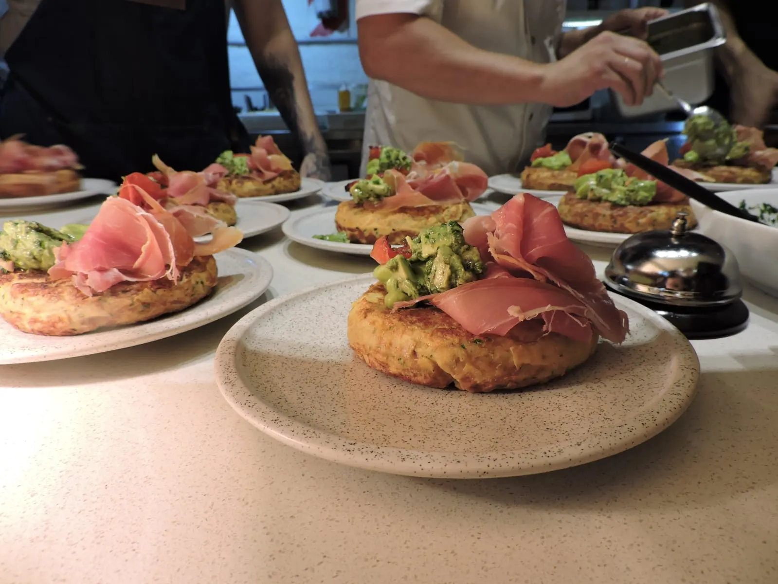 Tortilla brunchera: de papas con tomates confitados, alioli, palta y jamón crudo. Bien babé, el jamón entra como trompada en el combo. Genial. ¿Tortilla con palta? ¿Cómo no se nos ocurrió antes? Hay versión veggie.