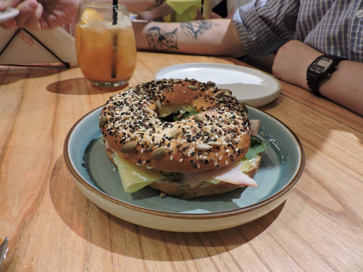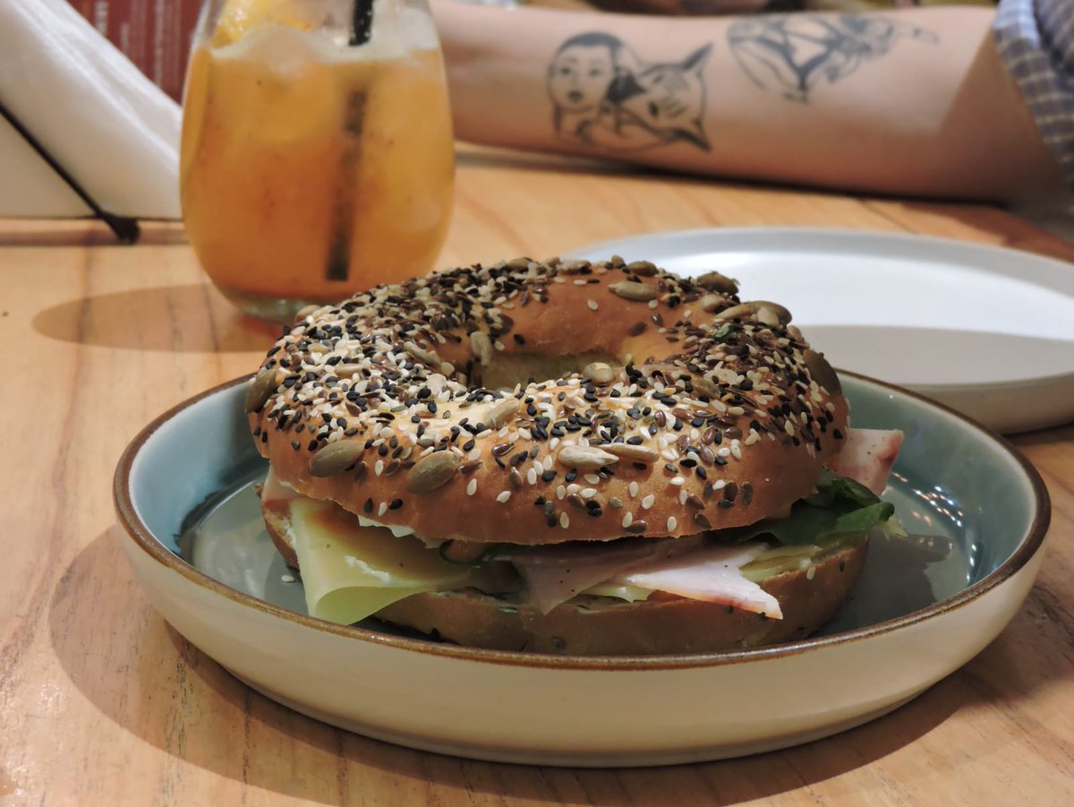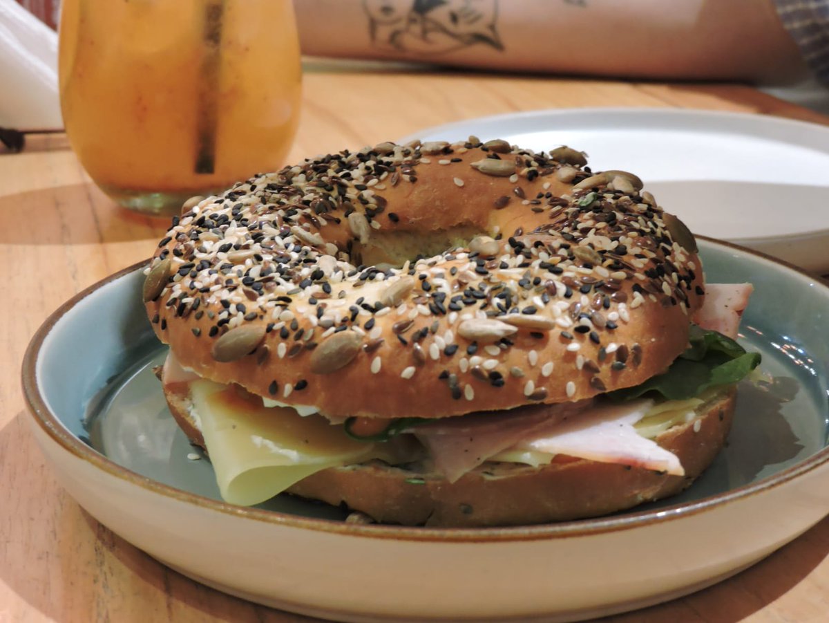 Lo primero que trajeron fue este Bagel de Lomito bestial: con compota de tomates, queso fontina, crema de hierbas y rúcula. Muy buen bagel, mucha cantidad y calidad de relleno. Excelente sensación al moder. Las semillas, el fiambre… todo está bien.