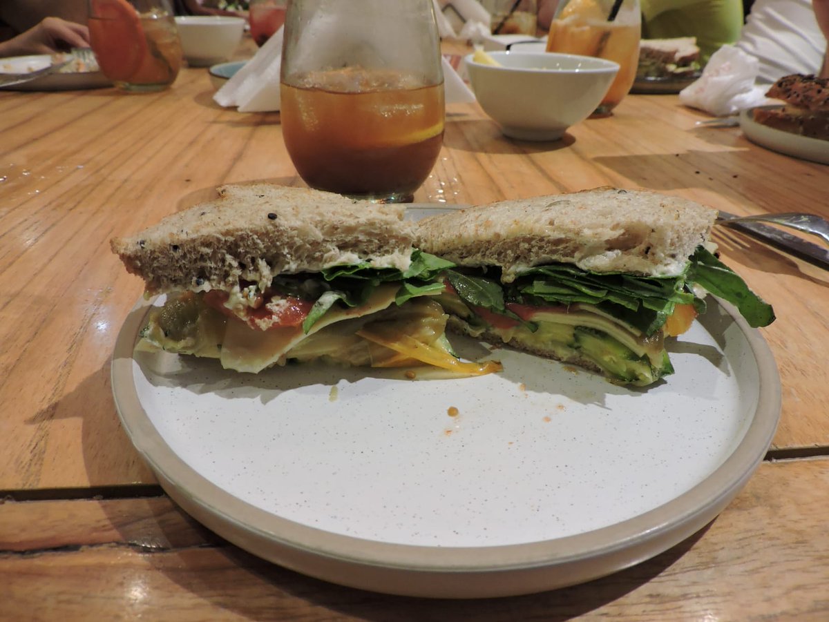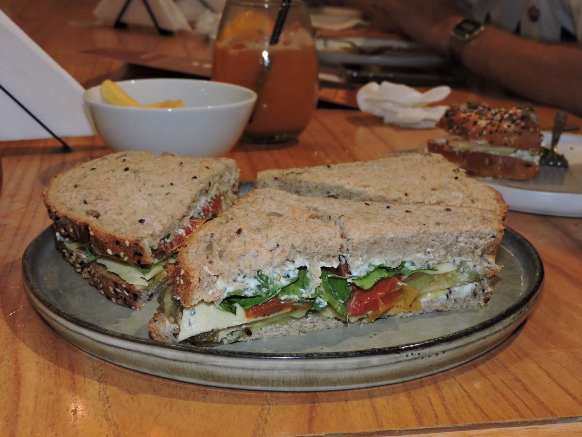 Sandwich veggie: pan de campo con semillas, vegetales asados (pepino, berenjena) tomate, rúcula, queso crema, queso danbo. Generoso tamaño. Buen pan.