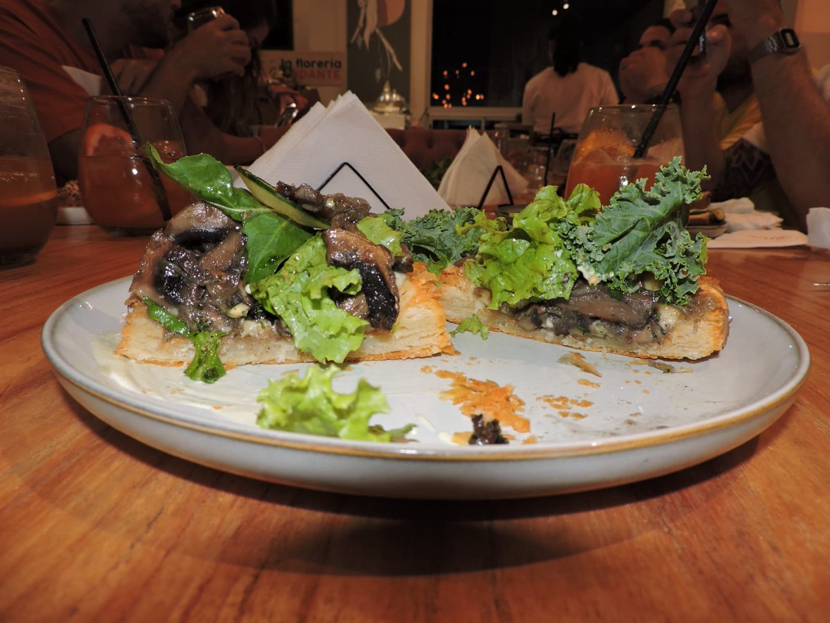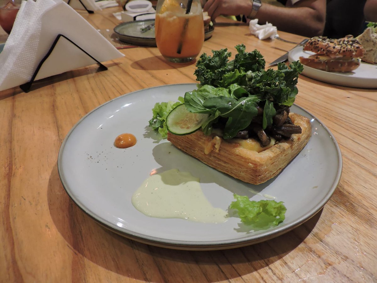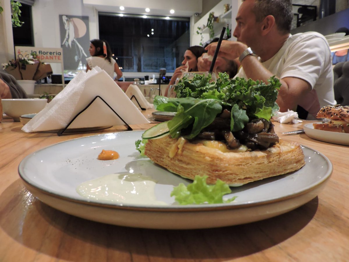 Hojaldre casero: con un picadillo de hongos, blend de quesos, crema de cebolla caramelizada y kale. Una sorpresa, me dejó de cara. Es como una factura de hojaldre con una torre de cosas ricas saladas arriba. Fabuloso.