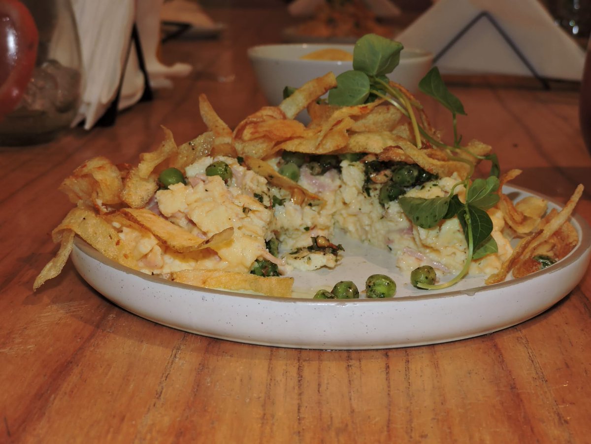 Revuelto gramajo: huevo cremoso, jamón cocido, queso fontina, arvejas y nido de papas. Buena reversión, con la papa cortada en láminas fritas anchas y finitas. Un sí.