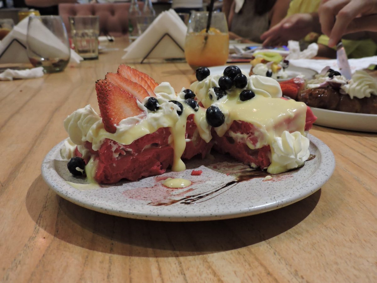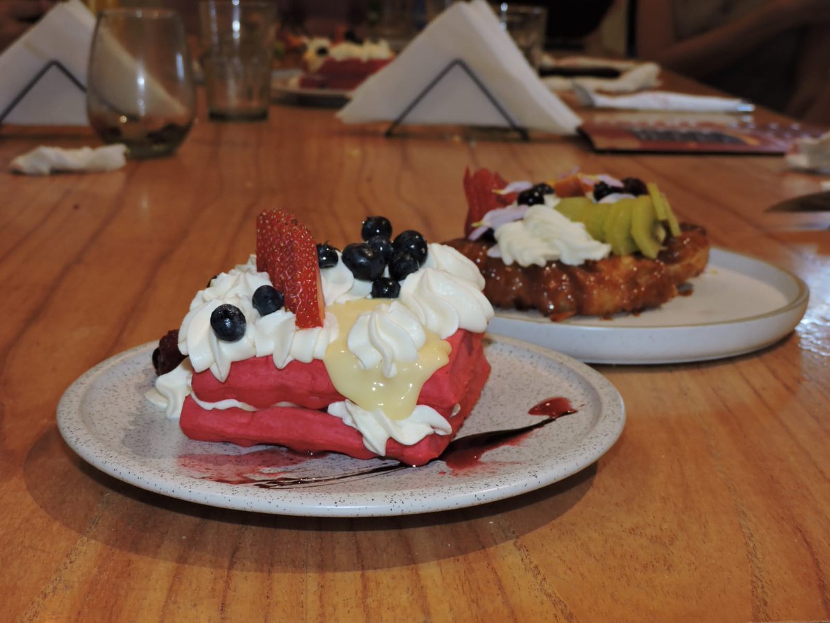 Waffle Velvet: de masa Red Velvet con curd de naranja, frutos rojos y crema chantilly. Es muy vistoso, pero a mi gusto al waffle le falta un poco de humedad. El topping es glorioso.