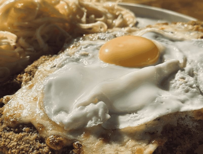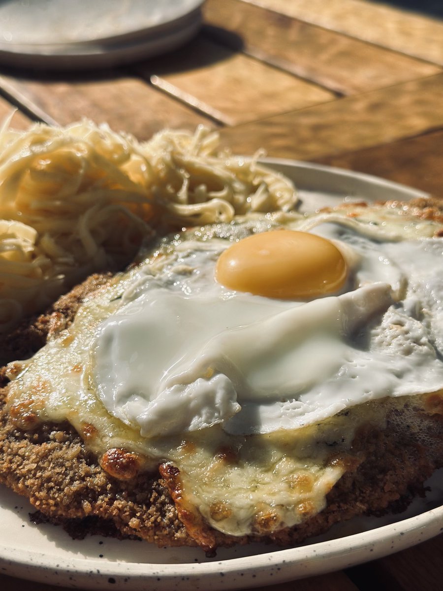 Milanesa napolitana con huevo y spaghetti al óleo: crocante, queso fundido y un huevo frito que llega con la yema intacta.