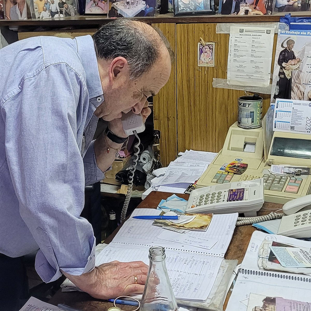 «No me gusta estar en la barra leyendo el diario mientras todos trabajan, no es para mí», dice y todo lo acompaña con señas y actuaciones sentado en su oficina del fondo, con estética de los 90, llena de estampitas y hasta una foto del Papa Benedicto XVI, donde dos teléfonos fijos en los que toma las reservas no paran de sonar.