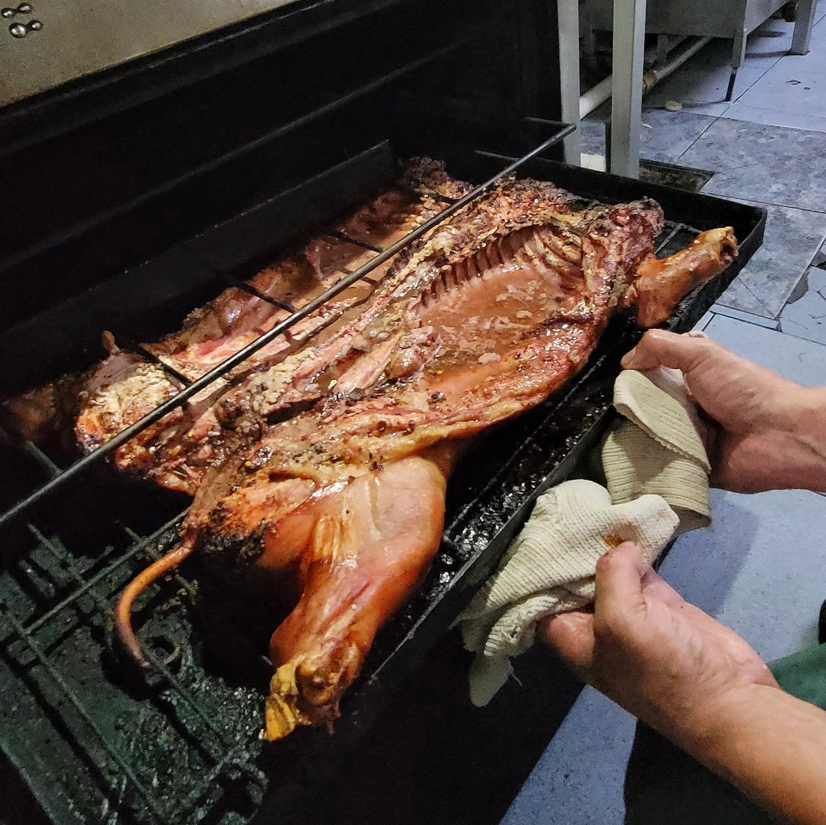 El menú incluye la entrada libre, un plato principal y un postre. DATAZO: los sábados hay lechón, y lo estaban cocinando en los hornos cuando recorrimos la cocina. Mirá lo que es eso. Lo hacen con el truco de la bandeja de agua arriba.