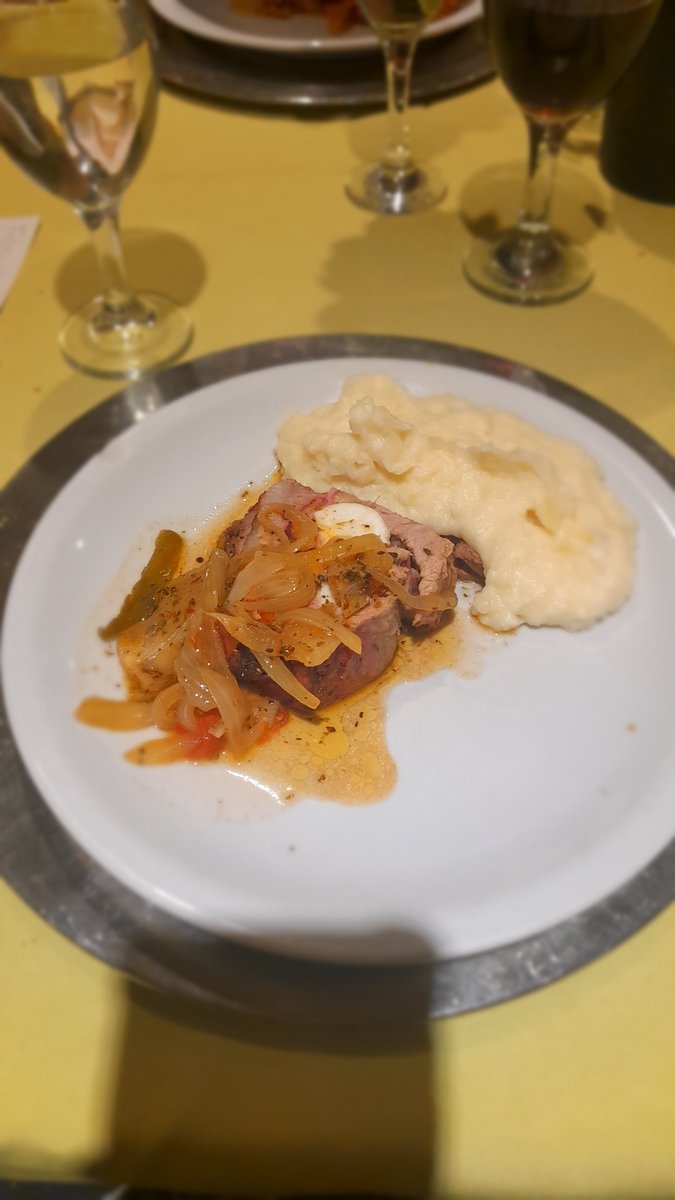 El menú también incluye un plato caliente, que puede ser pastas, carne al horno rellena (comí una punta de vacío tremenda), cerdo o pollo a la parrilla, y pescado. Sale todo con papas rejilla, al natural o puré. Las porciones son tranqui pero porque la entrada es una demencia.