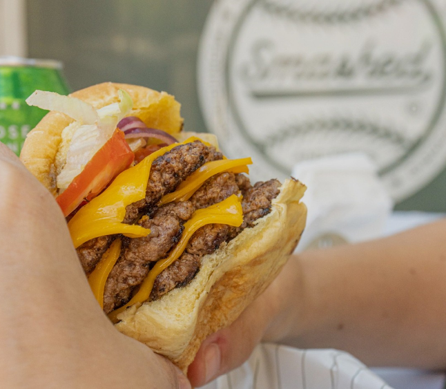 La forma smashed de cocinar una hamburguesa es hacer bolitas de carne, tirarlas en una plancha bien caliente y aplastarlas, lo que genera una crosta de carne y grasa crujiente que queda muy bien. Este es un lugar especializado.
