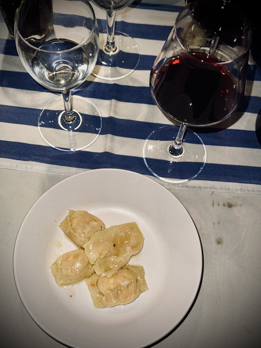 Anoche había una cena especial italiana, con maridaje incluido. 6 pasos de cocina con postre incluido y dos vinos hechos por un argentino en La Toscana, con refill casi libre, a $42.500. Un regalo.