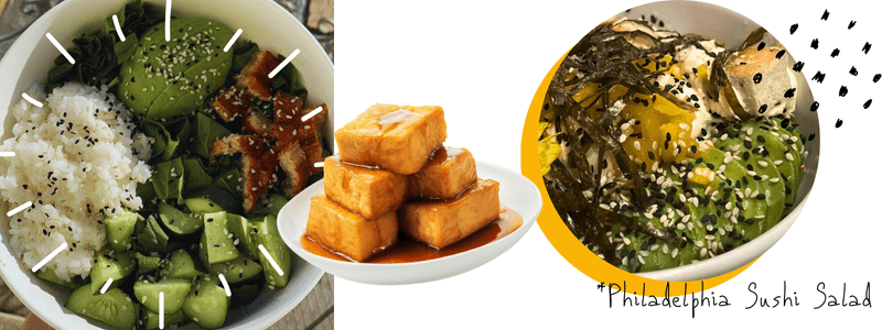 Opción veggie: Philadelphia Sushi Salad. Arroz de sushi, tofu salteado, palta, queso philadelphia, mango, alga nori y mix de sésamo tostado. Muy buena calidad de los ingredientes. Exquisito el tofu.