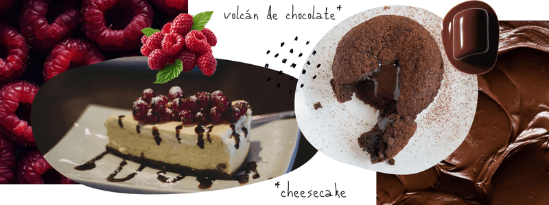Postre: cheesecake de frutos rojos y volcán de chocolate. Estaban muy ricos pero a esa altura ya estaba casi ciego de comer.