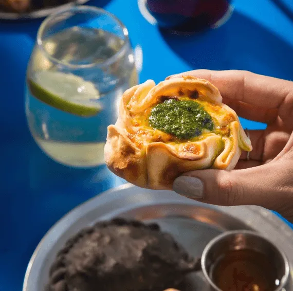 3. Pero la mejor de estas es la de humita, muy loca. Le ponen puré de boniato, queso vegano y albahaca. La mitad del relleno es de choclo triturado y la mitad en granitos. Queda con una textura muy copada.