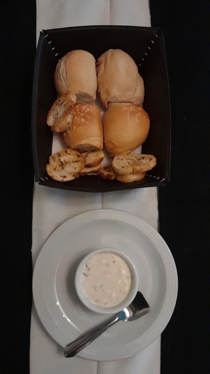 Llegamos muertos de hambre porque veníamos del gimnasio (hay que compensar) y atacamos la cortesía que era una crema con especias caprese y una panera riquísima, con un muy buen pan (vital para comer pasta) y tostadas con especias.