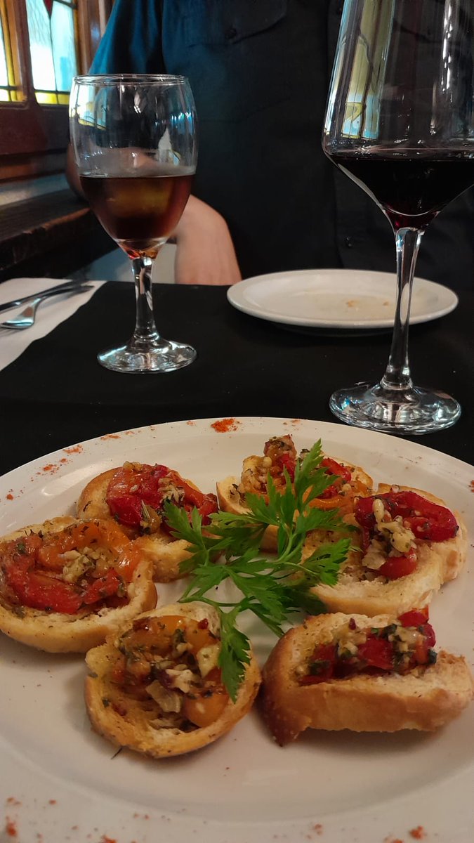 Además, para probar algo más típico, comemos unos pimientos asados en escabeche de ajo sobre tostadas estilo bruschetta. Bastante tradicional, bien hecho, MUY ajoso.