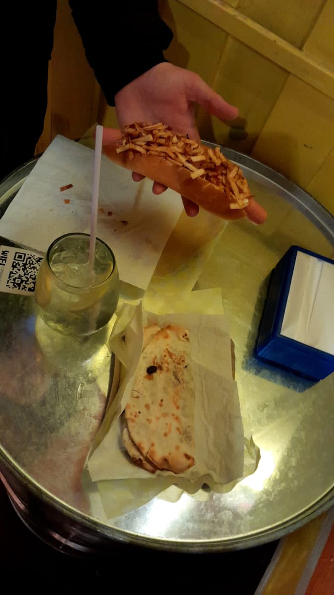 Para tomar hay birra artesanal, gin, vermut y fernet a precios populares. Para comer, super panchos con lluvia de papitas o burritos vegetarianos y con carne.