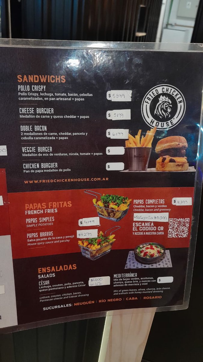 Después venden papas simples ($4200), bravas ($4300) y completas con cheddar, bacon y verdeo ($4400). Podrían estar algo más crocantes, pero de sabor estaban bien y hechas en aceite nuevo. También hay ensalada César $4600 con bebida.