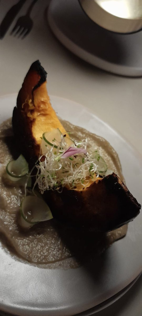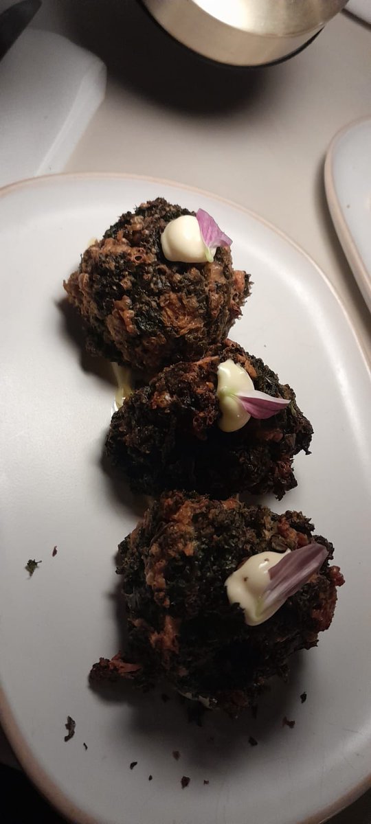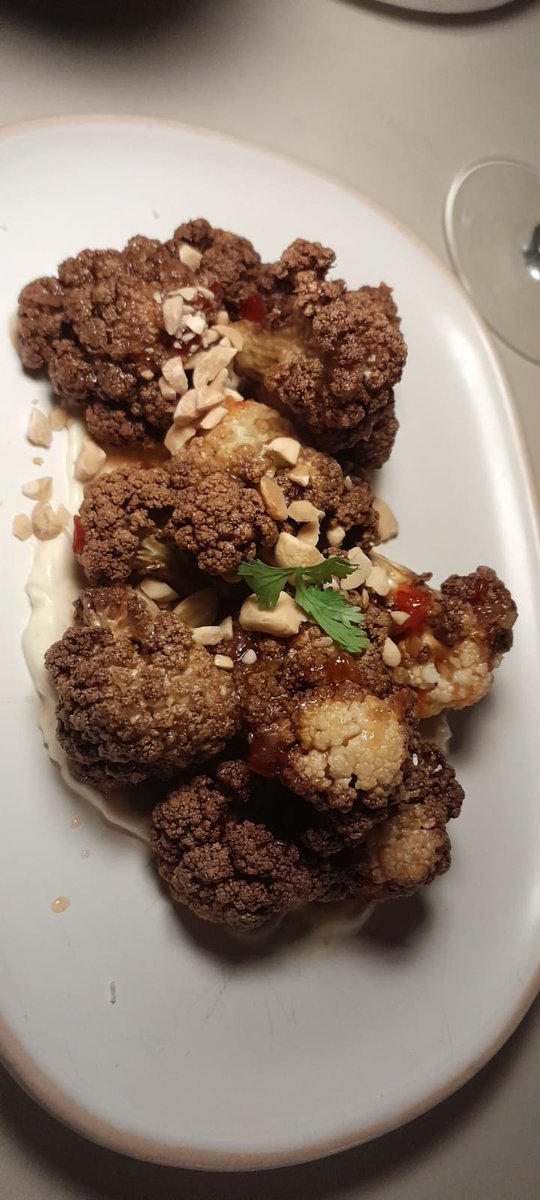 Hay muchas opciones veggie. Pedimos buñuelos de Kale, un coliflor al horno con chili dulce y una salsa asiática, hummus de zanahoria con garbanzos crocantes y cabutia con babaganoush y alfalfa. Todo estaba bárbaro. Con esos cuatro platos comimos dos personas.