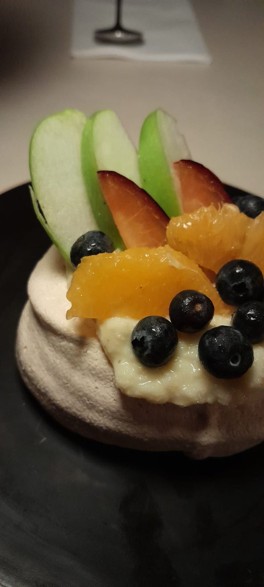 Bonus track: de postre comimos una pavlova, merengue coronado con frutas, con una crema pastelera de coco que nunca había probado y me pareció un delirio de rico.