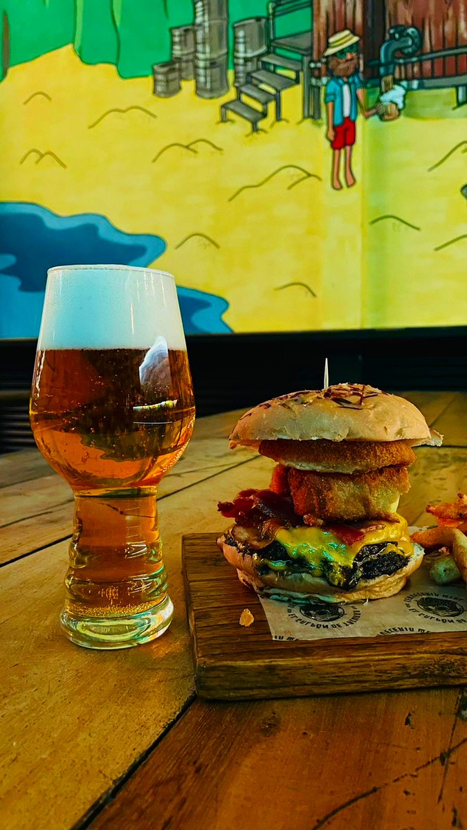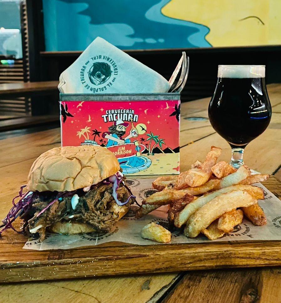 La comida es rápida, al paso, para acompañar la birra: hamburguesas, sandwiches, pizzas y papas. Pero un par de productos tienen su encanto. La burger BBQ es bestial: doble medallón con cheddar, muzzarella rebozada, bacon, un aro de cebolla en pan de queso y salsa BBQ $9500