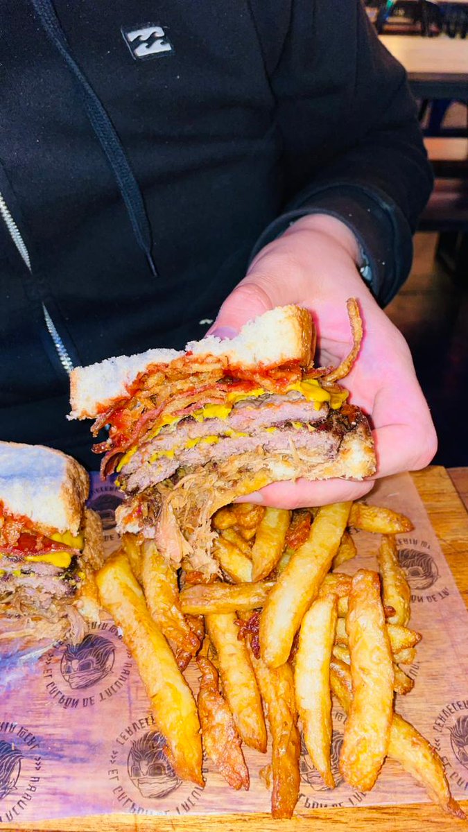 También está bueno el Pulled Pork: entre panes de molde, doble medallón de tapa de asado con cheddar, bacon, cebolla crispy, bondiola desmechada y barbacoa. $9500