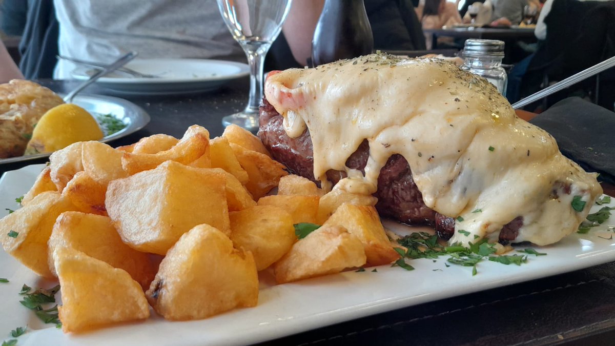 De principal pedí el entrecot napolitano, un bloque de carne majestuoso, alto y magro, coronado con queso derretido y tomate. También me preguntaron el punto de la carne y lo respetaron.