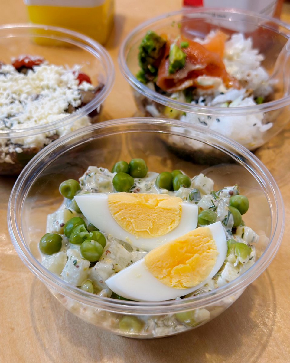PAPAS Y HUEVITOS: la entradita que más me gusta. Clásica, rica y contundente. Papa, huevos de campo, arvejas, cebolla morada, alcaparras, oliva, mayonesa y eneldo. Tiene un sabor excelente, es como una ensalada rusa premium sin zanahoria. $4.700