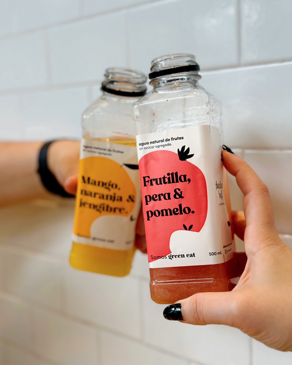 Para tomar: un AGUA DE MANGO, JENGIBRE Y NARANJA y otra de FRUTILLA, PERA Y POMELO. Son aguas naturales de frutas sin azúcar agregadas. Se hacen todos los días y no tienen conservantes. 500 ml. $2.600