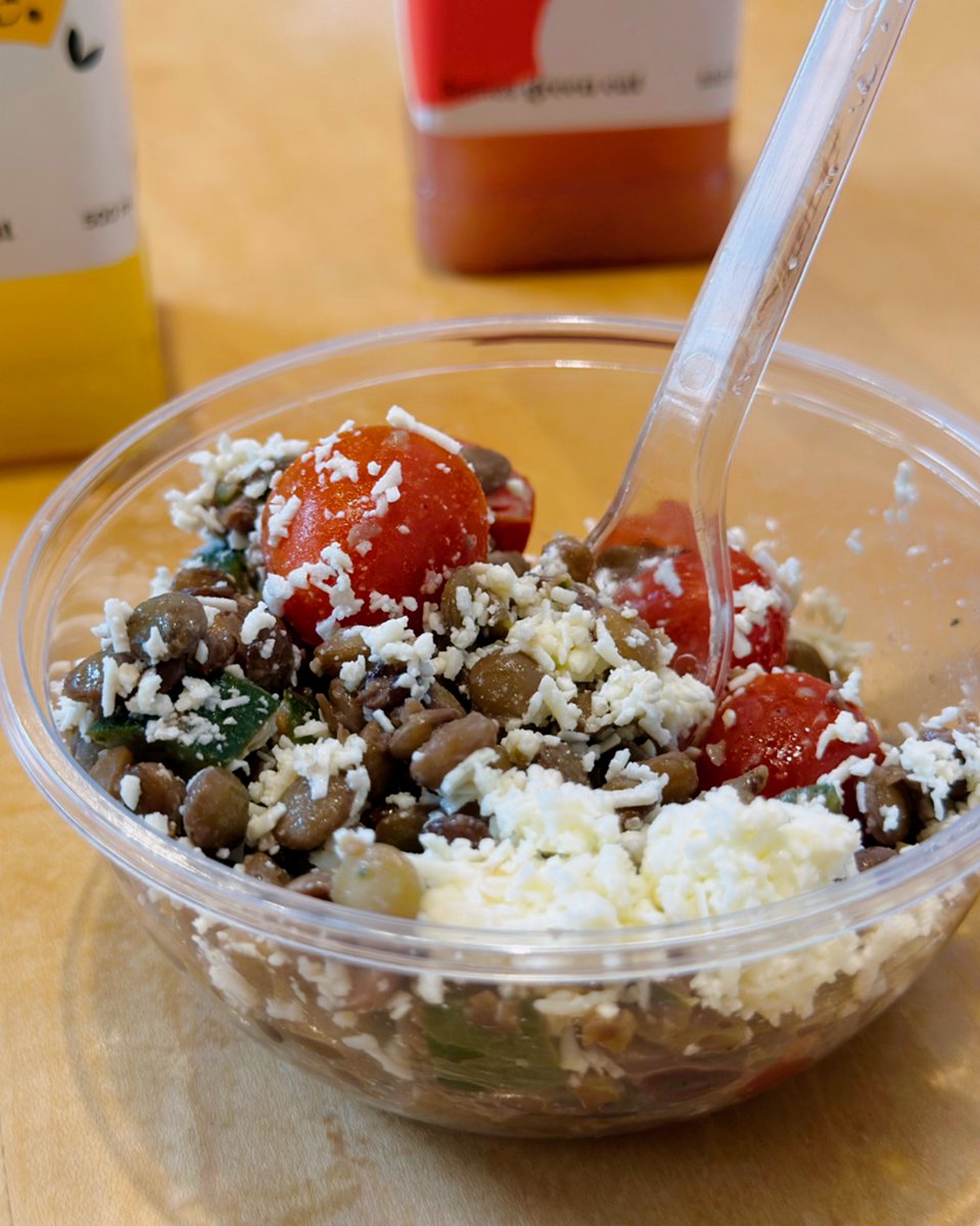 Una nueva de este verano es la GREEK: lentejas, tomates cherry, queso rallado, pepino y aceitunas negras con pesto de hierbas. Fresca, tiene una vinagreta y es veggie. $4700, pero atención que con la app de Green Eat tenés 3 entraditas con 20% off y quedan 10k.
