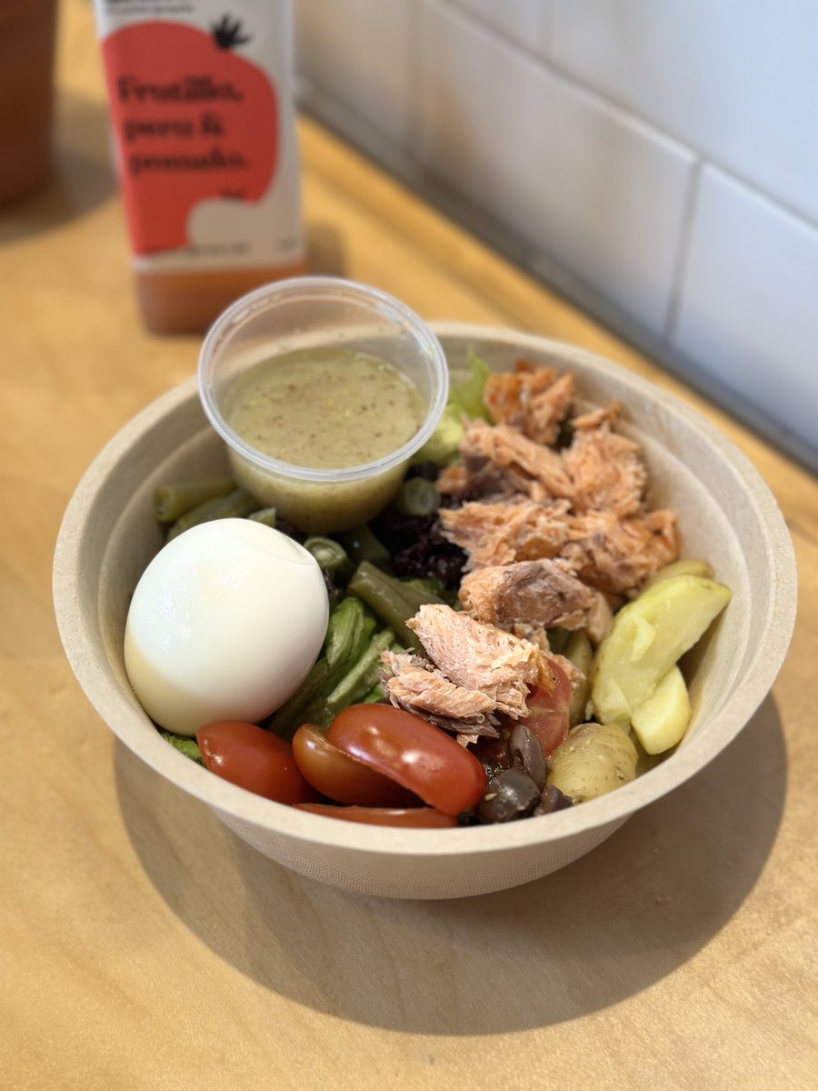 La ensalada TRUCHA SALAD es para darse un gusto comiendo sano: trucha al horno, huevo soft, papines, chauchas, aceitunas negras, tomatitos y mix de verdes con aderezo de oliva, limón y mostaza. Proteica, fresca, llenadora. Ideal si te mataste en el gym. $14.300