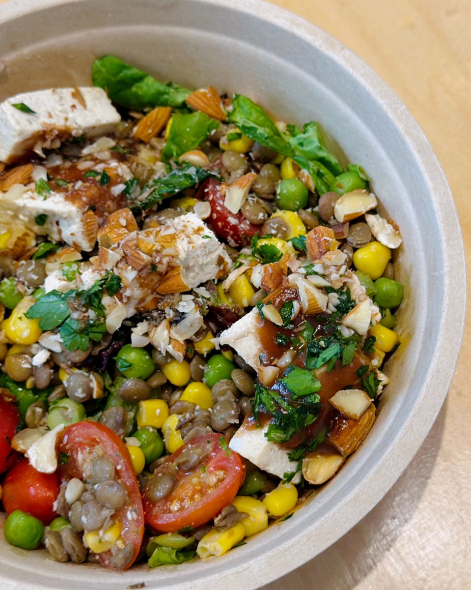 Yem probó la TOFU BBQ (el tofu está muy bien logrado salteado con barbacoa) con lentejas, praliné de almendras, tomates cherry, arvejas, choclo y mix de verdes con pesto de hierbas y gajos de limón. Vegana. $12.900