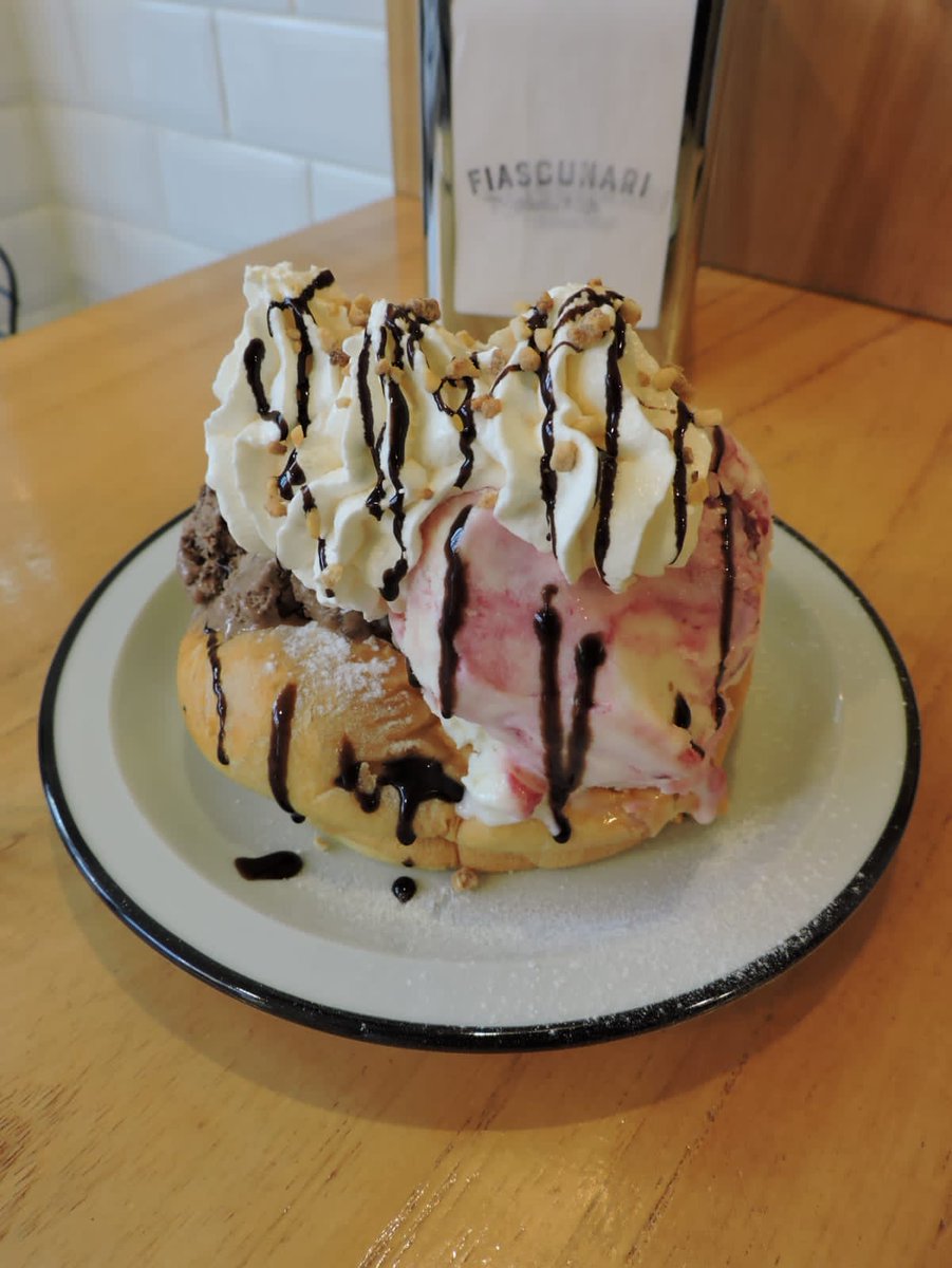 Nosotros elegimos chocolate rocher y mascarpone c/amarena (cereza italiana). Queda bien la combinación de un sabor dulce y otro más ácido qué contraste, es lo que se recomienda. Parece un pan de hamburguesa, pero al mismo tiempo es tipo pan dulce.