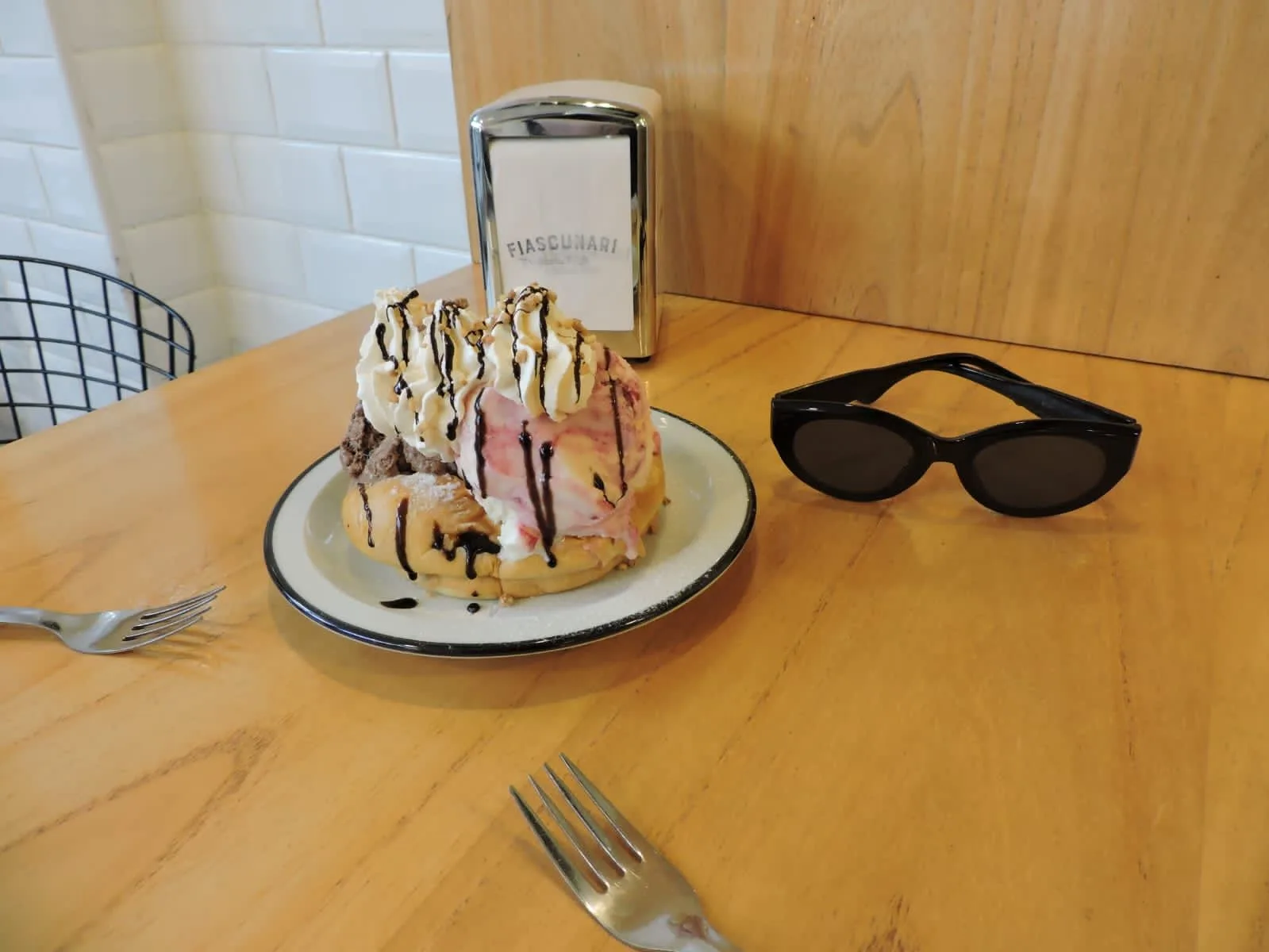 La estrella es un Pan Brioche con helado, como un sanguche. Es un pan de leche dulce, redondo, con una corteza salada que se corta con azúcar impalpable. Lleva helado y crema. Y arriba salsa de chocolate y crocante de maní.