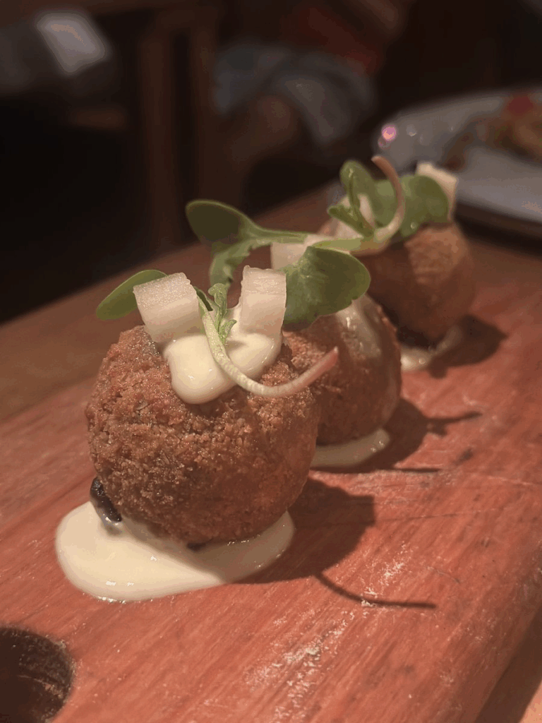Los platos juegan con una mirada a la tradición desde una perspectiva de cocina moderna. Esta es una croqueta de morcilla, peras al sous vide y lactonesa de queso azul: tres sabores que jamás se me hubiera ocurrido juntar, y que quedan muy bien.