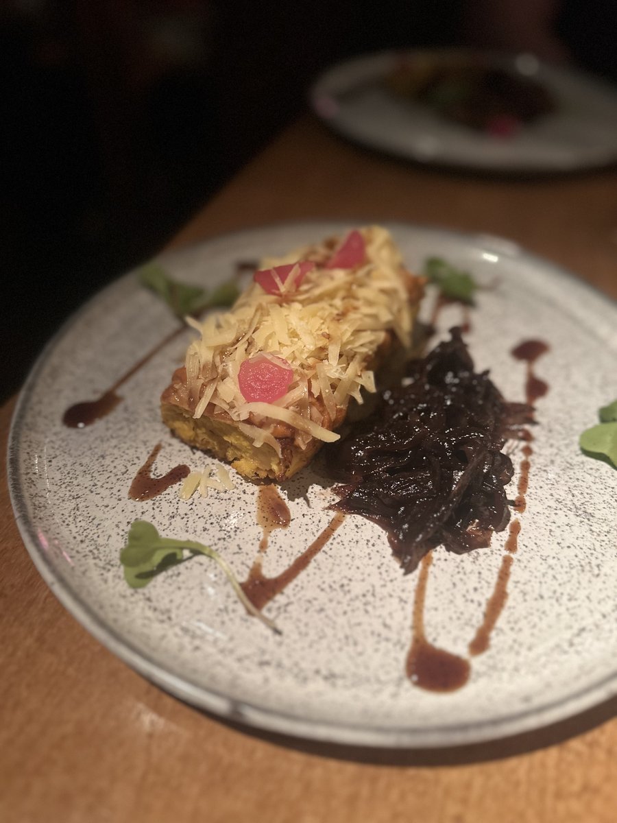 Este era un rectángulo crocante de Chipaguasú, con romesco y chutney de cebolla morada. Excelente utilización del chipa como base, con mucho queso y el juego agridulce con el acompañamiento. Una de las cosas que más nos gustaron.