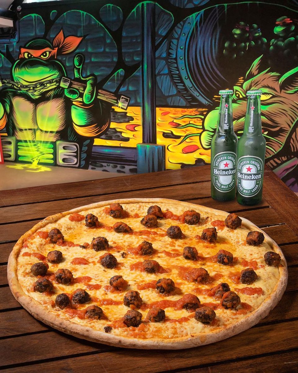 Estilo NY. Salsa italiana, tamaño XL (54 cm diámetro, el doble de lo normal). Masa elástica, sabores locos como albóndigas o vegana del 98 y una estética joven, cool y retro nostálgica de los 90s que la diferencia mucho de otras propuestas.