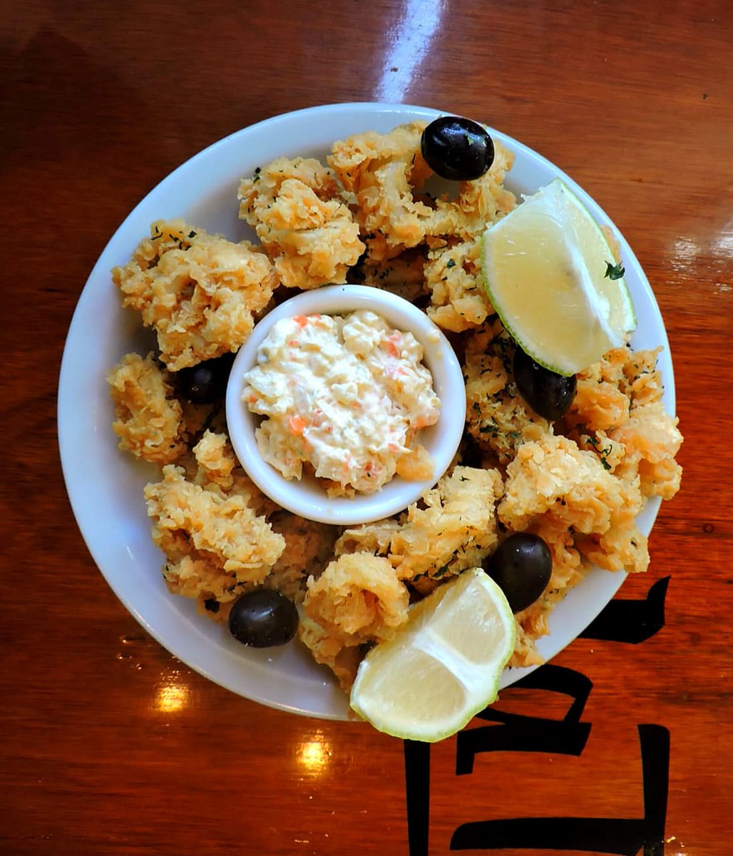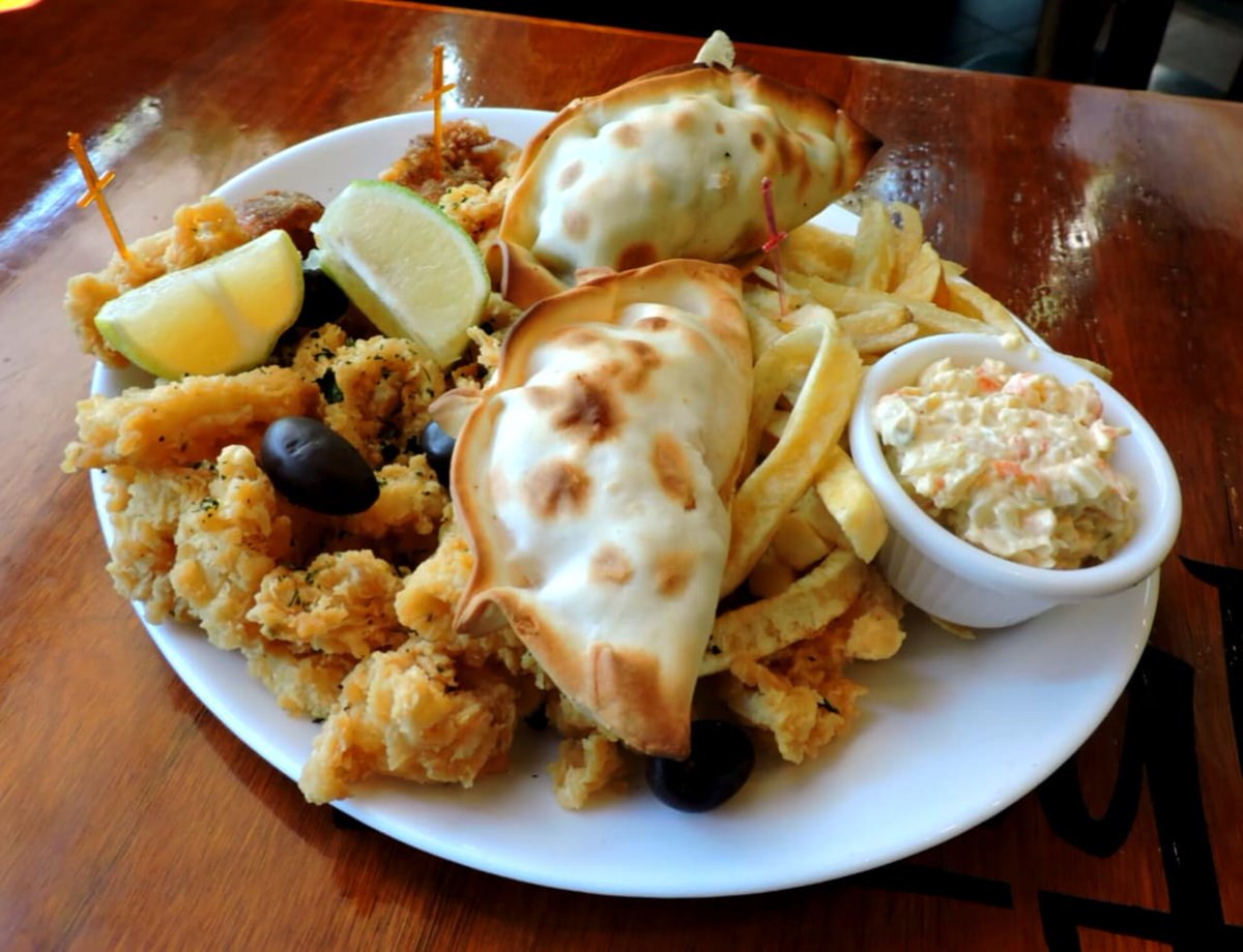 Arrancamos con una tabla de rabas, papas fritas, dos empanadas, dados de queso rebozados, aceitunas y salsa tártara. $15.700. Comen dos bien. La porción de rabas, un clásico de Pellegrini, muy generosa. Bien sequitas, buena fritura y rico rebozado.