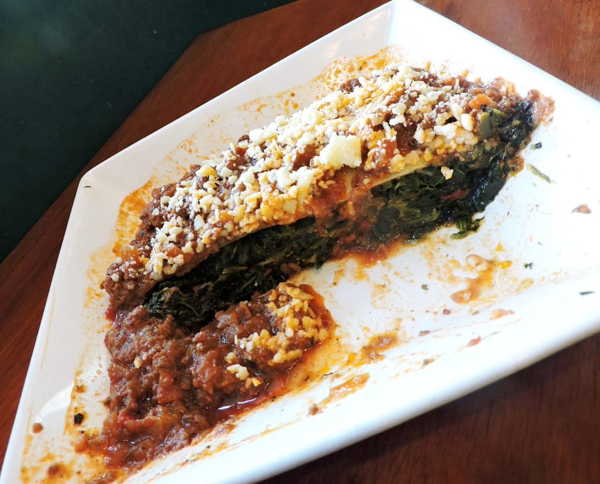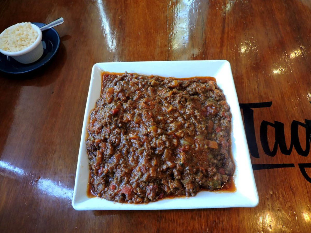 Yo me clavé una lasagna de verdura y carne con una bolognesa brutal. Viene literalmente enterrada bajo una montaña de salsa con mucha carne picada. La foto no miente.