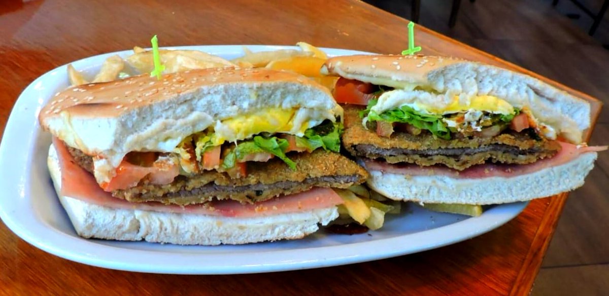 El sándwich de milanga con jamón, queso, lechuga, tomate y huevo cumplió con creces. Sale con fritas. Tamaño dinosaurio. Casi te diría que es para dos personas normales o un Nico Maggi. El que lo pidió no lo pudo terminar. $6100.
