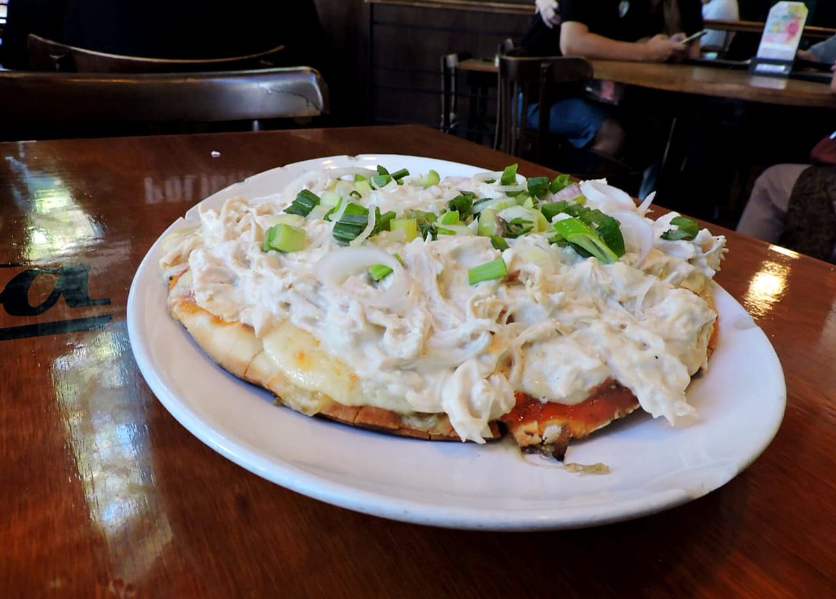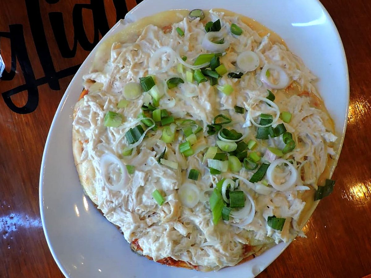 Pizza de pollo a la crema de verdeo. $8200 la de 4 porciones. Creo que tenía una pechuga de pollo entera arriba. Masa finita y crocante. La pizza es a la parrilla, de las pocas que quedan en Rosario.