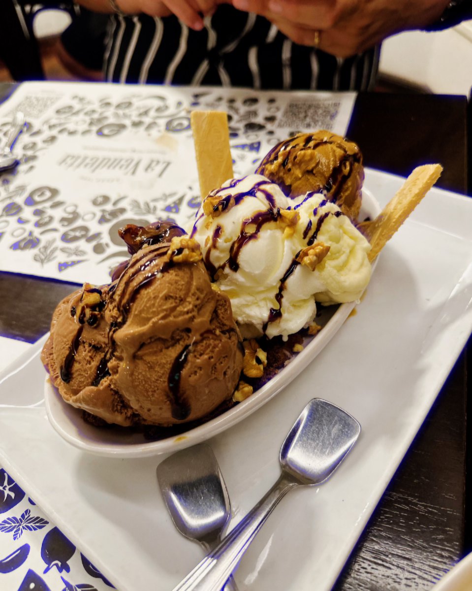 Copa La Vendetta: tres bochas de helado, nueces, dulce de leche, obleas Opera y base de brownie. Para compartir $8.800. Me resultó curioso que era diferente a la del local del Alto. Se ve que cada uno le da su impronta.