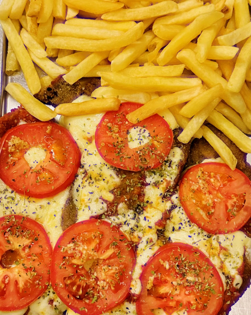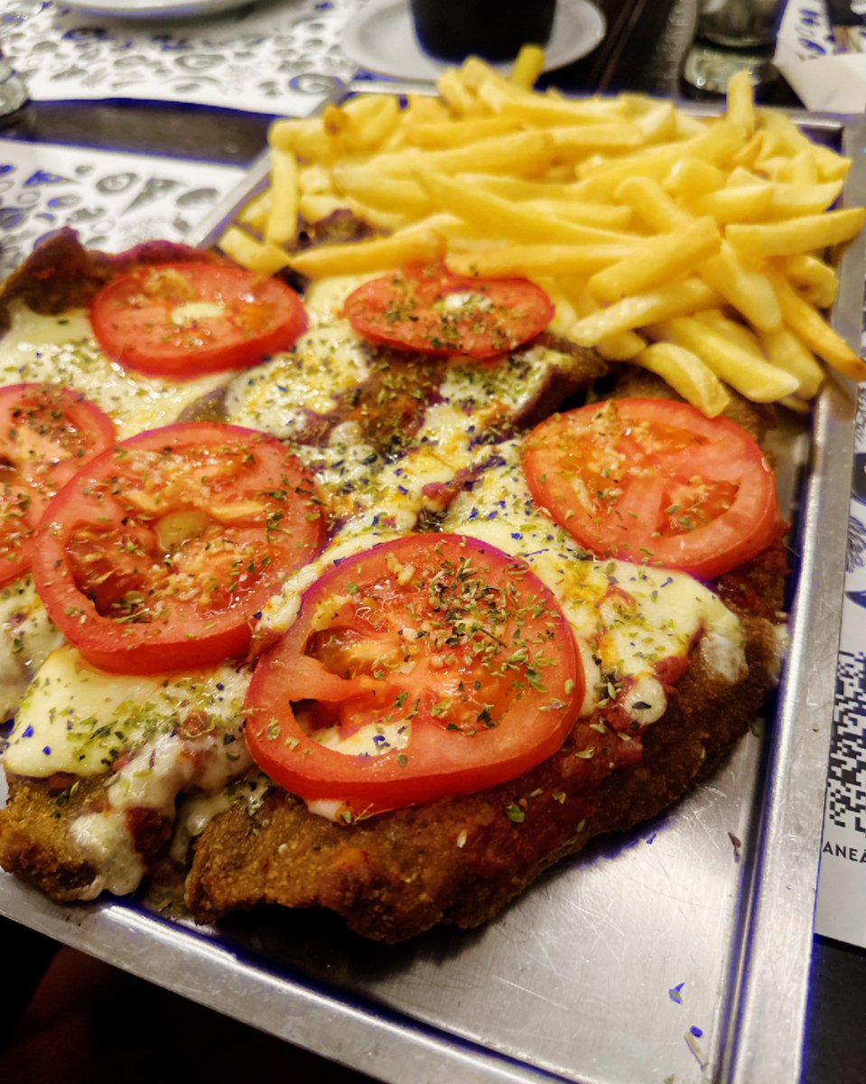 Yo fui por algo más clásico, que para mí es el sabor a probar a la hora de una pizzanesa. La napo: salsa, muzza, rodajas de tomate, y ajo. $33.000 con papas. Sale en 5 minutos, es muy rápido el servicio. Buena salsa, mucho ajo arriba.