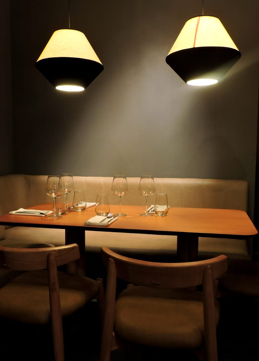 Es chico, 30 cubiertos, ideal para ir en pareja o grupos pequeños, íntimo, música tranqui, luces bajas, lámparas, no griterío. Sillas y mesas cómodas de Selema (mueblería top de diseño).