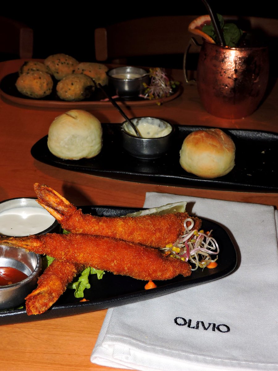 Dúo de mar: Langostinos rebozados en panko y rabas. Salsa de alioli casero y jalea picante.